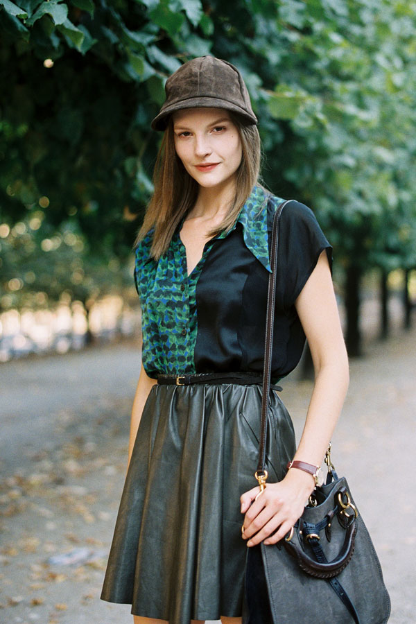 Labels: Sara Blomqvist; model off duty; Paris Fashion Week SS 2012; Paris Street Style; deerstalker hat; leather skirt; brown ankle boots; sleeveless patterned shirt