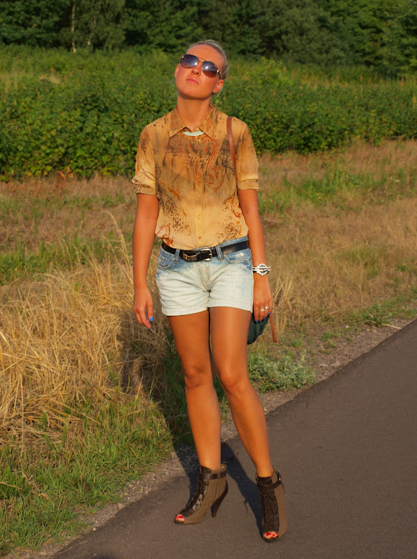 Pomieszanie z poplątaniem jednym słowem :) Jakbym chciała wymienić wszystkie trendy w tytule posta zawarte w tym zestawie to zasnęlibyście już przy jego czytaniu :) Ale oczywiście w opisie nie może tych jakże istotnych informacji zabraknąć :) Otóż na pierwszy plan wysuwają się -widoczne z 50 kilometrów (tutaj cytuję mojego męża) - SPODNIE W KOLOROWE WZORY, połączone z ŻÓŁTĄ koszulką i JEANSOWĄ KAMIZELKĄ (kolejne hity tego lata ;) ). Nie możemy zapomnieć także o dodatkach: torbie-WORKU w kolorze MIĘTOWYM z ĆWIEKAMI, ASYMETRYCZNIE WYCIĘTYCH szpilkach z Zary, okularach AWIATORKACH, KOLOROWYCH BRANSOLETKACH i dużym ZEGARKU. Jakby tego było mało są jeszcze NIEBIESKIE paznokcie i KOCZEK na głowie :)